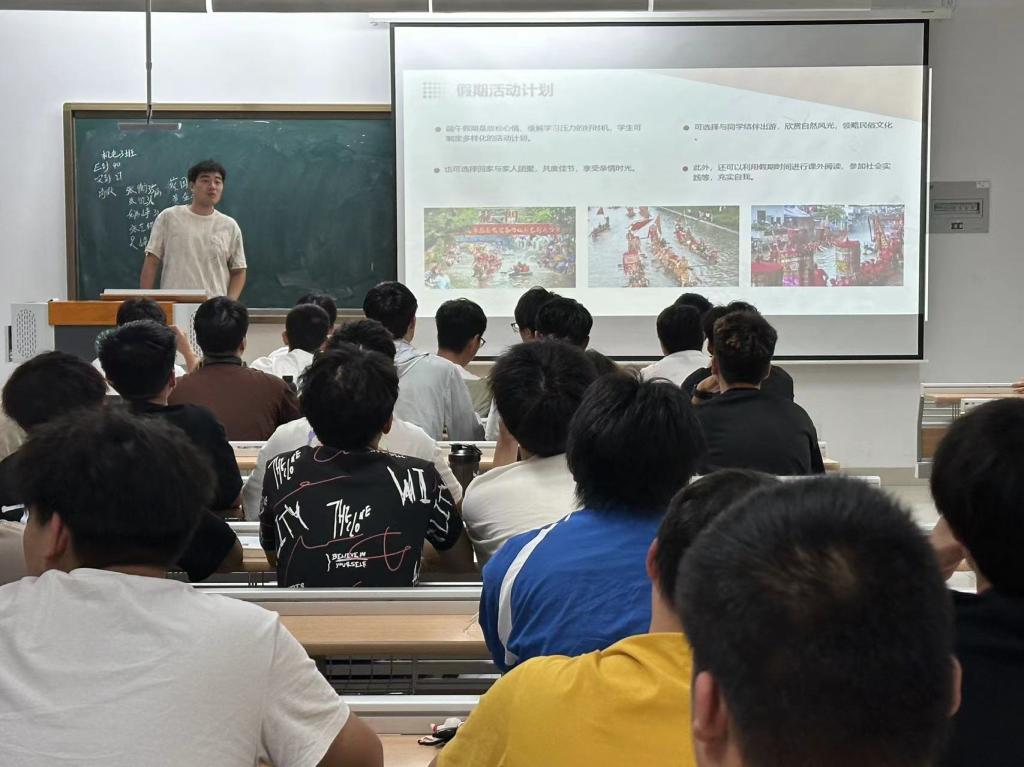 端午将近,“安全重于泰山”。为了切实做好端午节放假前学生安全教育工作,提高同学们的安全防范意识和自我保护能力,确保同学们度过一个安全、愉快的端午假期。机械电子工程学院于6月2日在大一各班自习室开展端午假期安全教育主题班会。