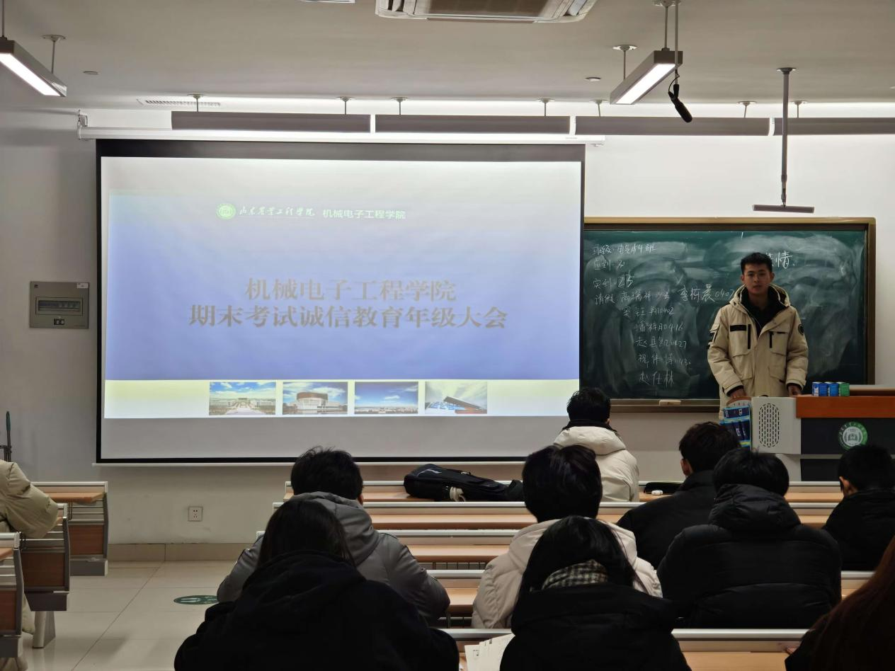 为进一步加强我院学风建设、严肃考风考纪,强化同学们的诚信意识,端正学生考试态度,营造公平公正的考试氛围。机械电子工程学院于近期组织召开了期末考试诚信教育年级大会。本次大会由各年级辅导员主持。