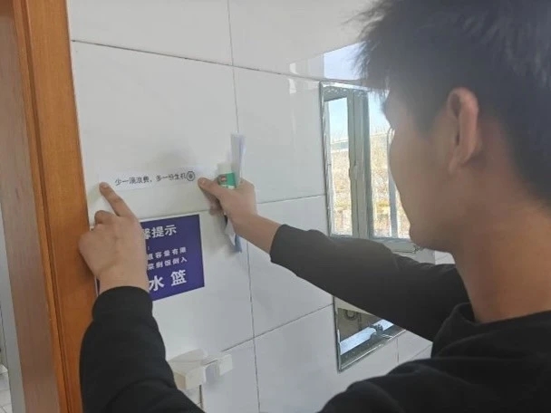 活动当天,学生志愿者们满怀热忱地早早集合,带着制作精美的节水小贴士奔赴各个地点。志愿者们分工明确,一部分负责在卫生间、水房的墙壁、水龙头旁张贴小贴士,确保每一处用水设施都能醒目地展示节水提示;另一部分则积极主动地与过往同学交流互动,热情分享自己日常积累的节水经验,深入探讨在校园生活场景中易于施行的节水小技巧,如“用盆接水洗碗可比流水冲洗节省大量水”“收集空调冷凝水用于拖地” 等。