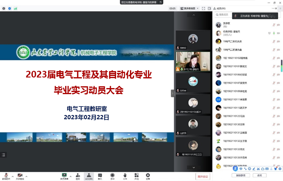 2月22日,电气工程教研室线上召开了2023届电气工程及其自动化专业毕业实习动员大会。会议由教研室主任潘莹月主持,团总支书记王世辉和相关指导教师参加了会议。
