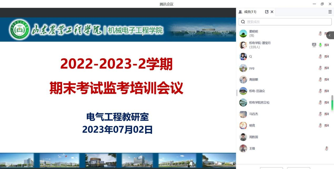 2023年7月2日,电气工程教研室通过腾讯会议召开2022-2023学年第二学期末考试监考培训会议,部署期末考试监考安排、监考纪律要求、突发情况处理等工作事宜。会议由电气工程教研室主任潘莹月主持,教研室全体监考老师参加了会议。