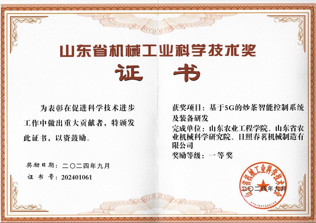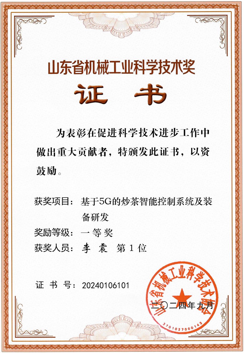 我院李震教授主持的“基于5G的炒茶智能控制系统及装备研发”项目荣获2024年度山东省机械工业科学技术奖一等奖。
