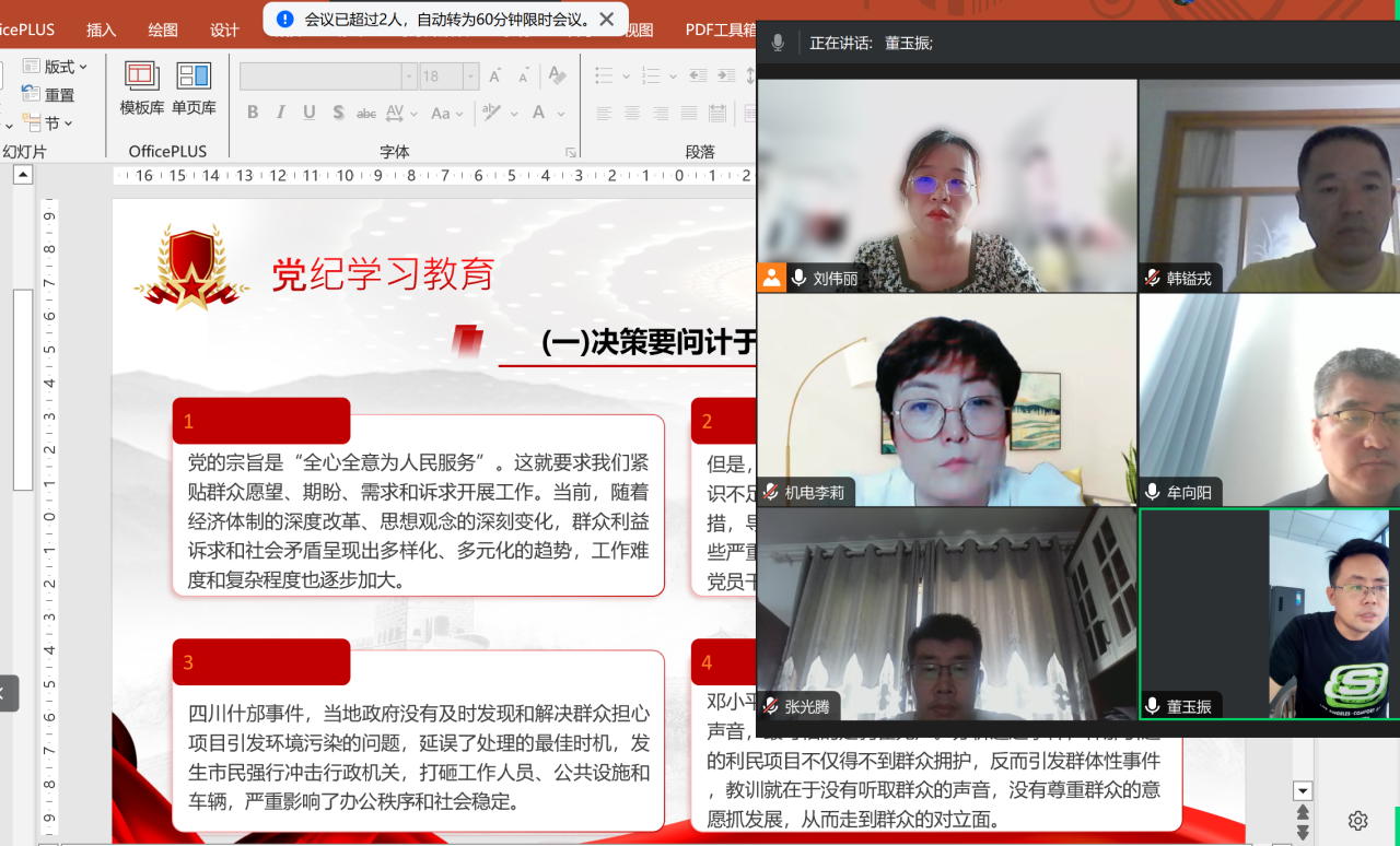 接着,支部副书记董玉振同志讲授了以《党纪学习教育——做一名合格的共产党员》的党课。从党史、中国近代史、世界近代史等多个维度,从周恩来、焦裕禄、杨善洲到基层党员的责任担当、公仆情怀、奋斗精神阐述了一代又一代共产党人高擎理想信念的旗帜,坚定执着、勇往直前,团结带领全国各族人民在中国这片广袤的土地上绘就了人类发展史上波澜壮阔的壮美画卷,迎来了中华民族伟大复兴无比光明的美好前景。