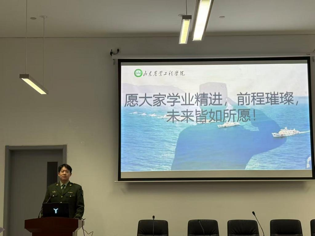 报告会伊始,于航同志首先以“铸盾深蓝,守民平安”为主题,结合在军旅生涯中执行抓捕走私、打击贩毒等任务的经历,分享了海警官兵日常训练与执行任务的真实故事,展现了武警部队英勇无畏、忠诚奉献的精神风貌。他强调,军人的荣誉感源于为保护人民群众生命财产安全贡献青春力量的坚定信念,并鼓励大家将个人理想融入国家发展,勇担时代使命。紧接着,由李春阳同志进行演讲。他主要参与海上活动,在维护国家海洋权益与沿海安全稳定的实践中展现了过硬本领与忠诚担当。他以军人的豪情诠释了新时代青年军人“决胜千里、猛虎下山”的战斗精神,以“摘四星荣光,立少年之志,以今日嘉奖,赴明日山海”寄语同学们珍惜时光、锤炼本领,将来在各自岗位上续写荣光。
