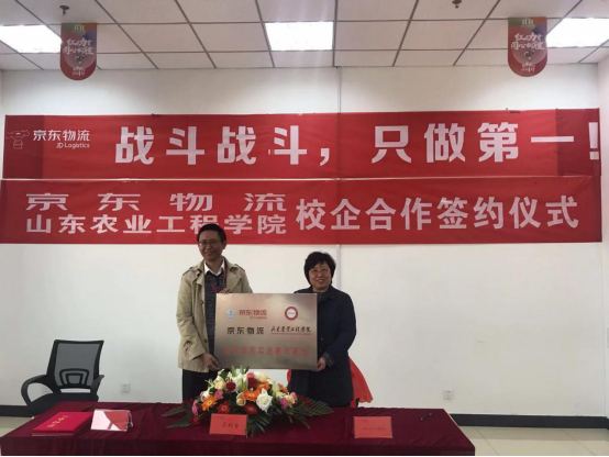 随后,经管学院院长李百秀和京东物流高级经理于飞签订了校企合作协议并为实践教学基地揭牌。