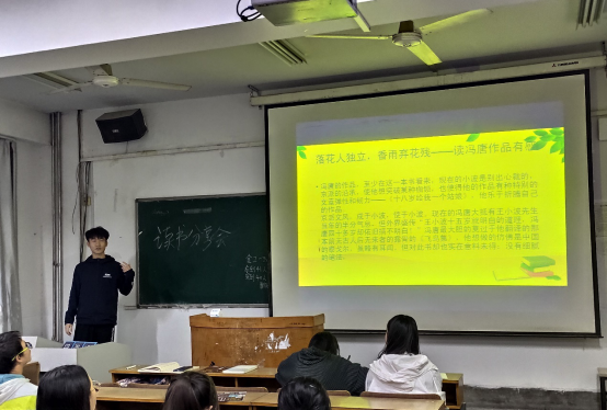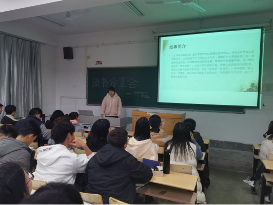 19级农林经济二班的李千,他向大家介绍了一本名为《了不起的盖茨比》的书,这本书告诉我们“爱是一种艺术”,拥有一颗宽容之心是人与人之间最温情的所在。