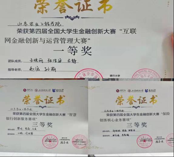 11月23日,第四届全国大学生金融创新大赛全国总决赛(本科组)在上海举行,经管学院2017级金融工程专业学生张浩安、吕静、王晓丽参加“互联网金融创新与运营管理”赛项获得一等奖,曹薇、樊晓、谷美参加“智慧银行创新服务”赛项获得三等奖,邵林林、张智洁、崔晶参加“保险创客核心业务”赛项获得三等奖。赵宏、孙萌、王鹏、周海霞、曲文俏、李贵梅获得优秀指导老师称号。