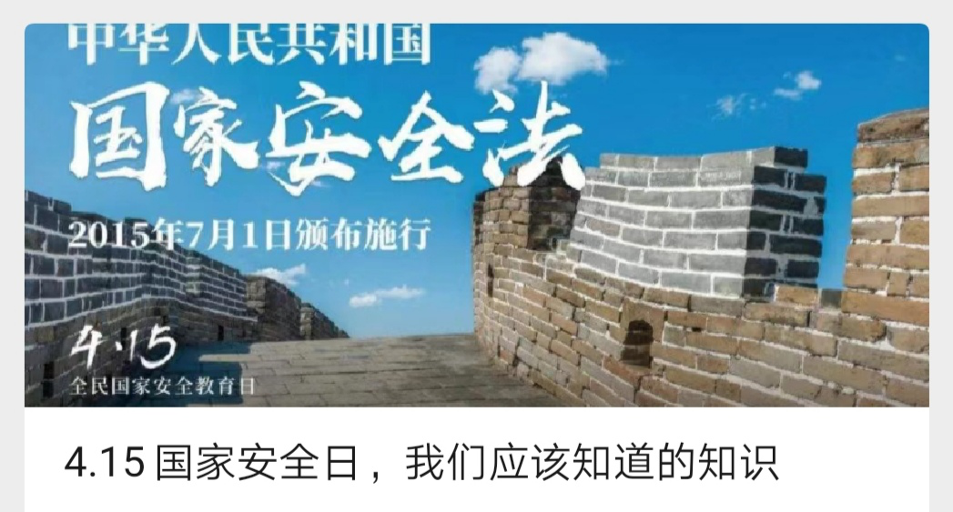 4月16日下午,开展以总体国家安全观为主题的“云”班会话“安全”,通过观看国家安全教育视频和网络学习习近平总书记全面依法治国新理念新思想新战略和坚持总体国家安全观的重要论述,并参与《国家安全法》《反间谍法》《反恐怖主义法》《网络安全法》《环境保护法》《核安全法》《保守国家秘密法》《密码法》等国家安全法律普法宣传活动。