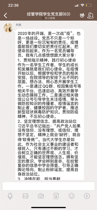 经管学院学生党支部3月5日晚上利用QQ群课堂,面向支部全体师生党员开展了“勇担社会责任,助力抗疫攻坚”线上主题党日活动。旨在进一步发挥基层党组织的战斗堡垒作用和学生党员的先锋模范作用,激发党员干部把思想和行动统一到中央重要指示精神和各级决策部署上来,全力以赴投入抗击疫情的攻坚战,为新型冠状病毒感染肺炎疫情防控工作加油助力,主题党日活动由党支部组织委员王硕珍同志主持,全体党员参加线上活动。