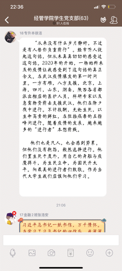 完成视频学习后,各位党员同志在群里纷纷分享了自己的感悟。大家表示,在这种特殊时期,大家通过“云”相约的方式,通过共学习、谈感受、齐行动,更加增强了疫情防控的责任感、使命感、紧迫感,增强了战胜疫情的信心和决心。