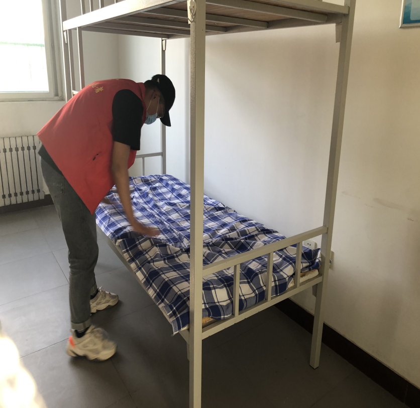 志愿者为即将住进隔离区的同学整理床铺
