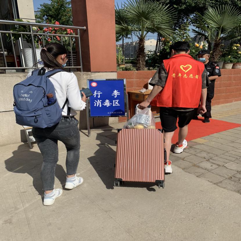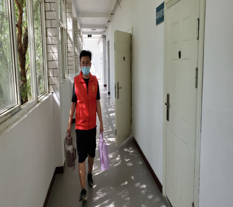 按规定,省外学生回校后要先做核酸检测,他们需要住进隔离区等待出结果。为了照顾他们在隔离期间的生活起居,安抚情绪,我院辅导员周海霞、王硕珍以及8位党员、入党积分组成的志愿者队伍做了细致入微的准备工作。