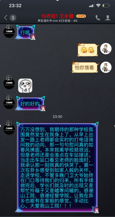 2019级农林经济专业1班的王永疆同学说:“从早上出发一路上老师都会实时的打电话询问我的动向,那一句句慰问真的如春风拂面。本来我离学校就很远,但是老师还是会准点在车站接送。当走出车站口看到老师的脸庞时,我承认那一刻我真的快哭了。第一次在异乡感受到如家人般的关怀。走进学校,所有手续做完后,学长们就及时出现又是帮忙拎箱子又是嘘寒问暖的。感谢山工院,感谢经管学院。让我在异乡也能有在家的般的感觉。手动比心。大爱我山工院!”