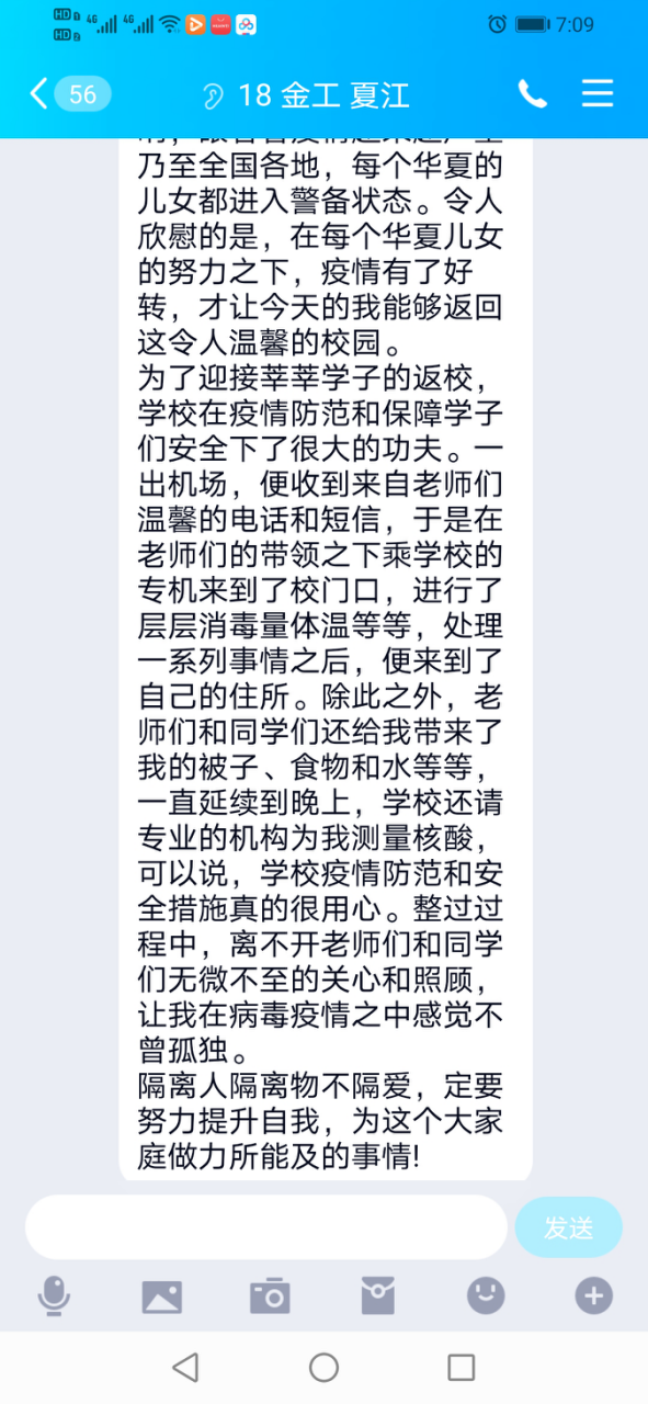 2018级金融工程的夏江同学说:”学校疫情防范和安全措施真的很用心。整个过程中,离不开老师们和同学们无微不至的关心和照顾,让我在病毒疫情之中感觉不曾孤独。隔离人隔离物不隔爱,定要努力提升自我,为这个大家庭做力所能及的事情!“