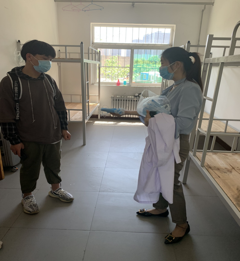 团总支书记周海霞给隔离区的学生送来口罩