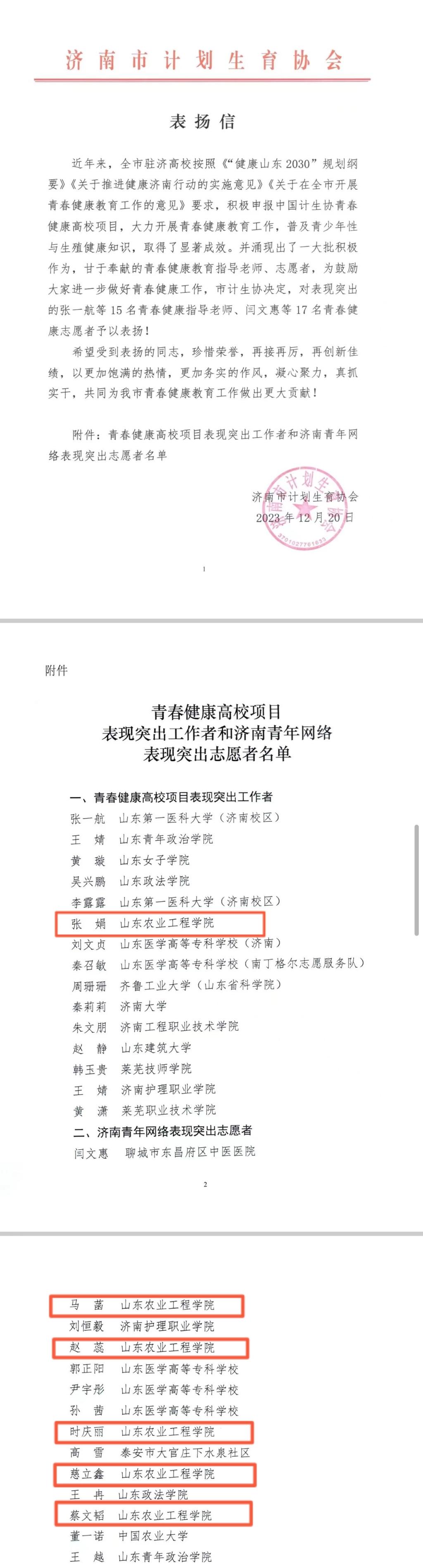 济南市计划生育协会按照《“健康山东2030”规划纲要》《关于推进健康济南行动的实施意见》《关于在全市开展青春健康教育工作的意见》要求,对积极申报中国计生协青春健康高校项目,大力开展青春健康教育工作,甘于奉献的青春健康指导老师、志愿者予以表扬。我院青春健康同伴社通过开展志愿服务,向青年学生宣传生殖健康、性别认同、心理健康、禁毒防艾等青春健康知识,以“提高青年人身心健康水平,树立积极向上、青春阳光的人生态度”为目标,推动青春健康教育、人生技能培训等工作,帮助青年学生树立正确的人生观、价值观和婚恋观。此次表彰是济南市计划生育协会对我院社团师生以往开展青春健康工作的鼓励和认可。