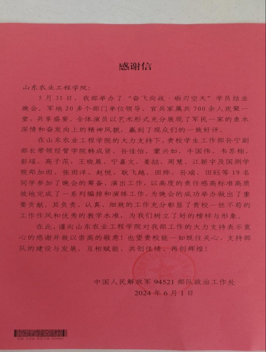2024年5月31日我院学子应邀参加部队举办的“奋飞向战,砺刃空天”结业晚会,我院代表学校参演了本次晚会,同学们用最热情的舞蹈,送上了最诚挚的祝福。