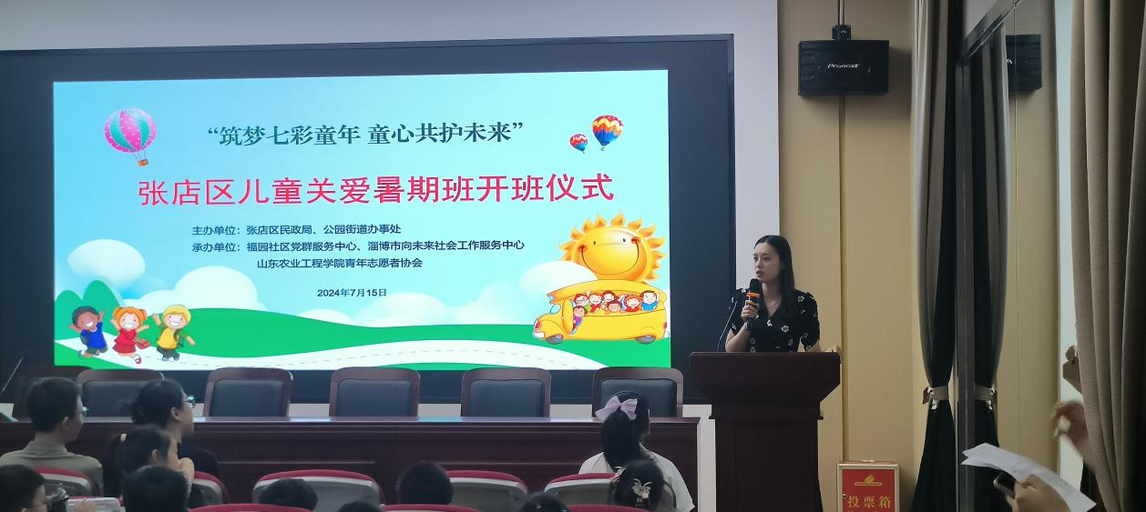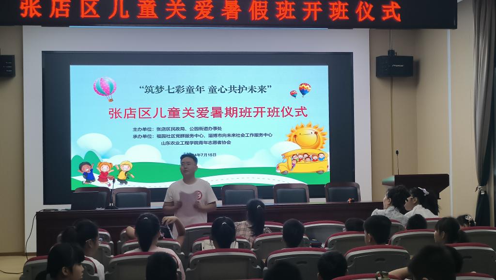 2024年7月15日,经济管理学院青春行中国梦暑假支教团在淄博市张店区福源社区党群服务中心举行“筑梦七彩童年 童心共护未来”张店区儿童关爱暑期班开班仪式。此次暑期社会实践旨在拓展学生视野、助力乡村教育事业发展蓬勃发展。