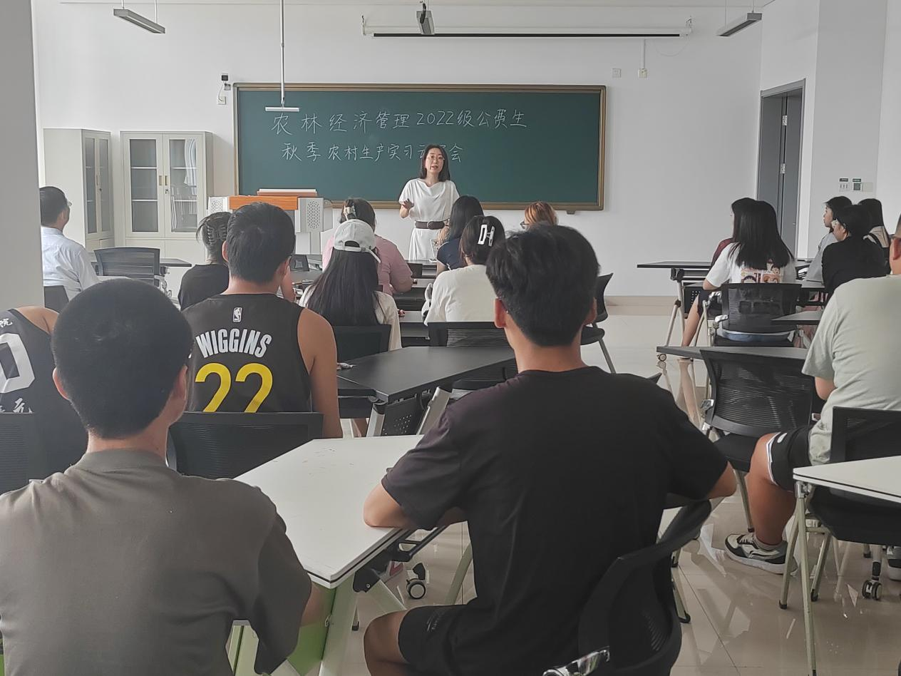 2024年9月2日下午,经济管理学院在淄博校区文法西楼A412召开2022级公费农科生实习动员大会,经济管理学院副院长曲文俏、农经教研室万常林老师及2022级农林经济管理全体公费生参加会议。