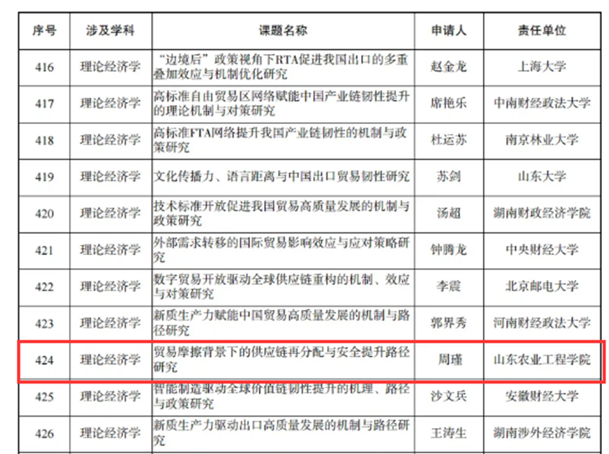 近日,2024年度国家社会科学基金年度项目评审结果公示,437ccm必赢国际官网经济管理学院周瑾博士主持申报的《贸易摩擦背景下的供应链再分配与安全提升路径研究》项目获批国家社会科学基金一般项目立项,实现了437ccm必赢国际官网在国家级科研项目上的重大突破。