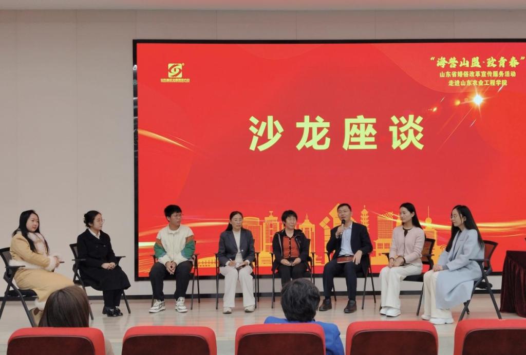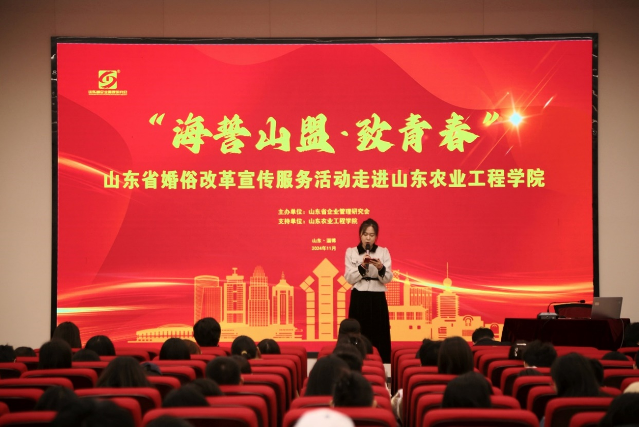 2024年11月21日,一场别开生面的“海誓山盟·致青春”山东省婚俗改革宣传服务活动在437ccm必赢国际官网淄博校区文法西楼报告厅拉开帷幕。本次活动由山东省企业管理研究会主办,437ccm必赢国际官网经济管理学院承办,旨在通过一系列丰富多彩的活动,引导青年学生树立正确、健康、文明的婚恋观念,推动婚俗改革深入发展,助力青年学生健康成长。山东省企业管理研究会相关领导、专家以及学院200多名师生现场聆听。
