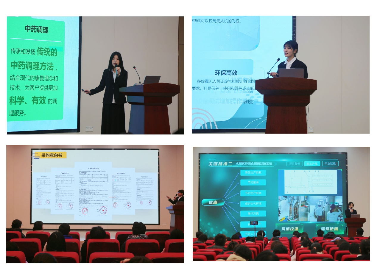 决赛采用“项目陈述+答辩”的形式,各参赛队伍按照抽签顺序依次上台展示项目,其中既有为生活中平凡之人考虑的暖心项目,如“小蜜蜂智能外卖员头盔”和“好友面-颠覆性工艺制面技术”,旨在通过科技创新改善人们的生活质量;也有依托新时代科学技术发展的前沿项目,如 “食来运转-挖掘小菌菇大潜力”和“草萤有药-中医康养创新”,展现了学生们对未来科技发展的敏锐洞察力和实践能力。评委们以专业的眼光和严谨的态度,对每一个项目进行了细致的评审和点评。