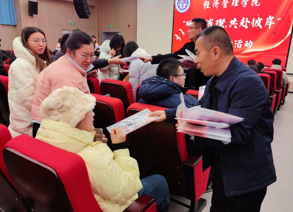 12月12日上午,我院在文法西楼A104报告厅开展考研赋能活动。经济管理学院院长李百秀、党总支书记马勇、党总支副书记杜锋、全体辅导员以及考研学生出席此次活动。