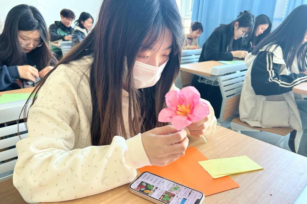 活动现场气氛热闹,同学们沉浸其中,充分发挥想象力进行自由创作,将手中的纸张制作成飞鸟、花朵等各种象征着生机勃勃的春日景物,从纸艺中探寻美学表达。最后,同学们在作品上以“春天”为主题进行了三行诗创作,将对春日的热爱倾注于纸笔之间。