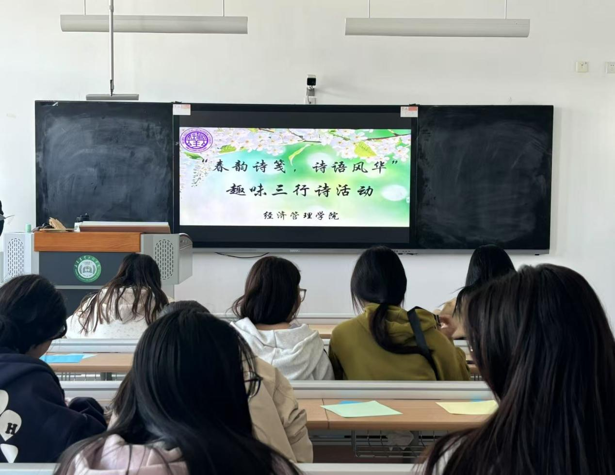 春日正暖,诗意正浓。2025年3月20日,经济管理学院在文法西A314教室开展“春韵纸笺,诗语风华”趣味三行诗活动。本次活动凭借丰富的创意和趣味环节,吸引了众多同学踊跃参与。