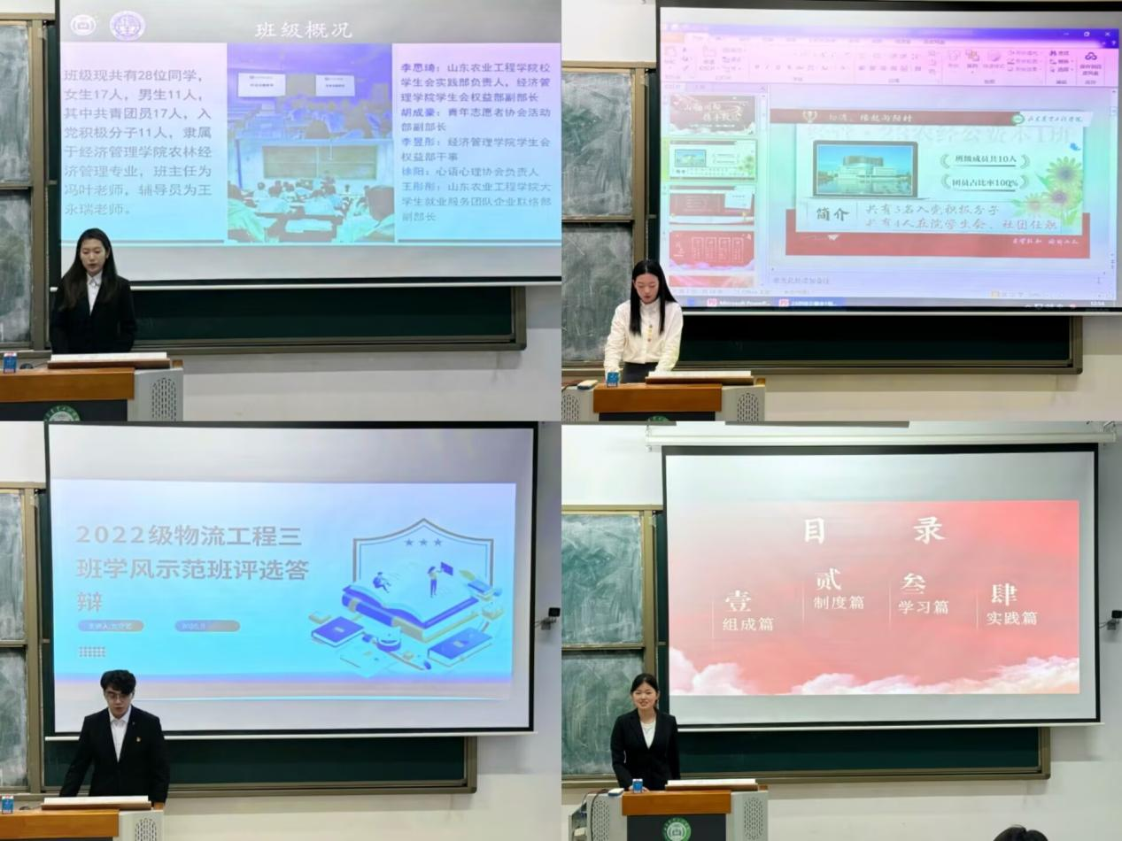 答辩现场,各优秀班级代表依次上台展示本班的学风特色,从学习环境的营造,到学习小组构建与运作,再到榜样引领与对未来的展望,充分展现了班级同学在学习生活中力学笃行的学习态度与团结奋进的集体精神。参与答辩的各班级学生代表全方位地向评委老师及在场同学呈现班级学风建设的丰硕成果。