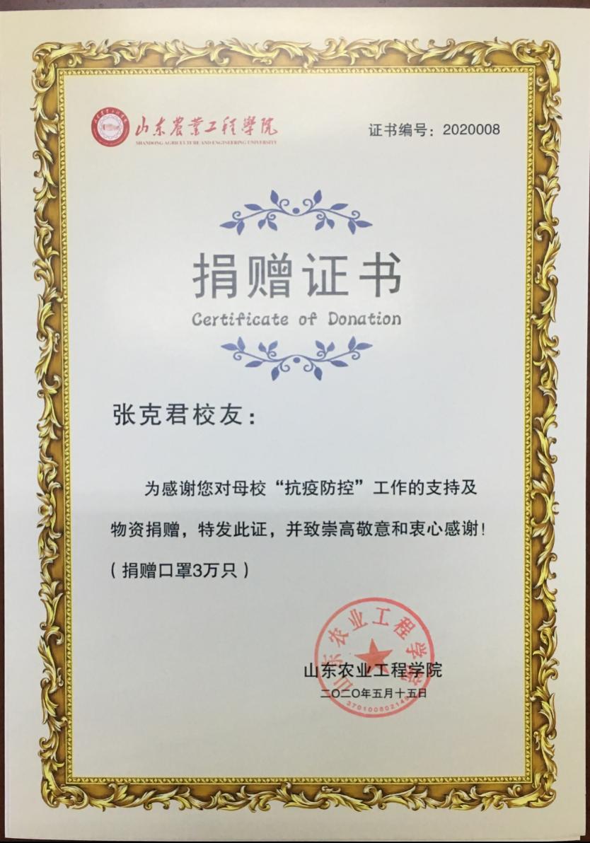 张克君校友热心社会公益事业,新冠肺炎疫情发生后,母校师生复学在即,2020年5月15日与同班同学程琳、曹勇、齐岭、车珂和崔红润,代表经管学院校友向母校捐赠一次性医用口罩30000只,用于新冠肺炎疫情防控,助力师生返校复学。他们的善举表达了校友们对母校的拳拳之情,体现了校友企业强烈的社会责任感和使命感。