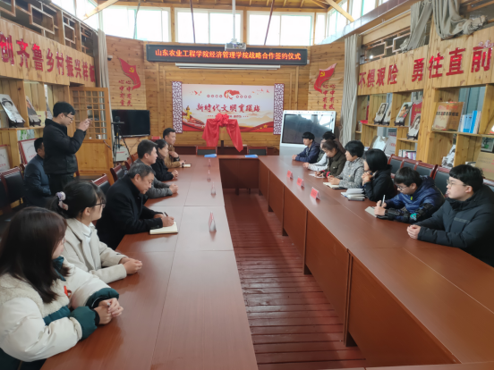 2021年3月18日,我院与济南石子口乡创文化旅游开发有限公司在时养山居民宿办公室举行社会实践基地签约、揭牌仪式并看望在此参加实习的我院学生。经济管理学院党总支书记颜素杰、刘春英副教授、团总支书记周海霞,章丘区文祖街道党工委副书记张波、文祖街道办副主任刘翠娥、石子口村党支部书记王化伟出席签约仪式,会议由时养山居民宿总经理孙同山主持。