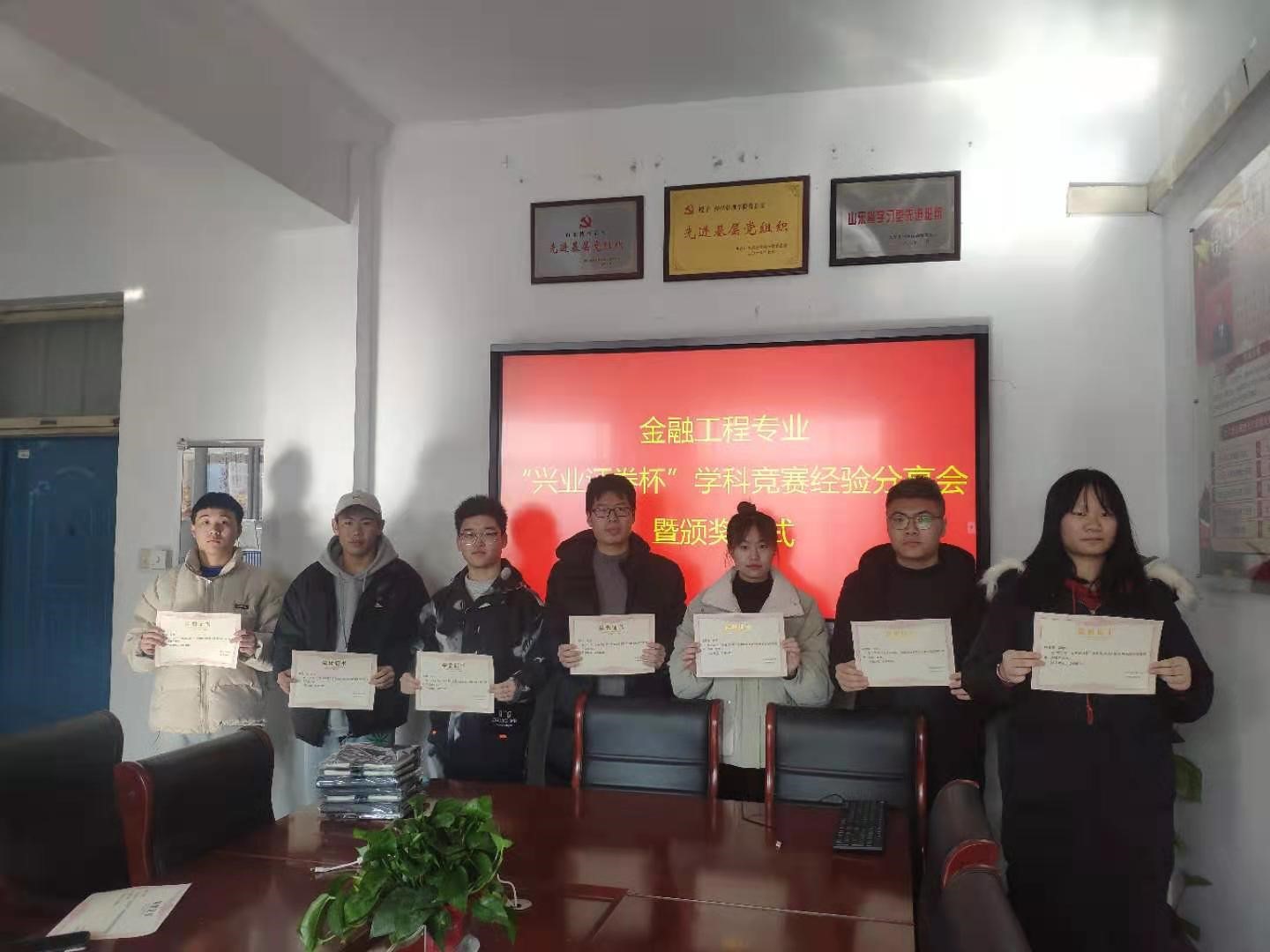 12月8日经济管理学院在济南校区学院党建活动室举行了“兴业证券杯”全国高校模拟投资精英挑战赛获奖选手颁奖仪式暨经验分享会,金融工程教研室主任孙萌和2017级政治辅导员靖荣文老师为获奖选手颁奖。