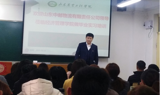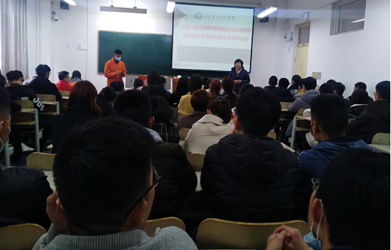 中邮物流有限责任公司曹洪波经理和综合部黄文静经理分别从职业生涯、岗位分配及实习内容等方面向同学们作了介绍与引导。