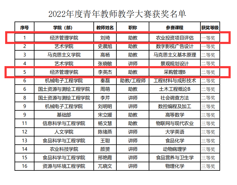 近日,学校举办的2022年度青年教师教学大赛获奖名单揭晓,我院刘琦、李英杰老师荣获一、二等奖。