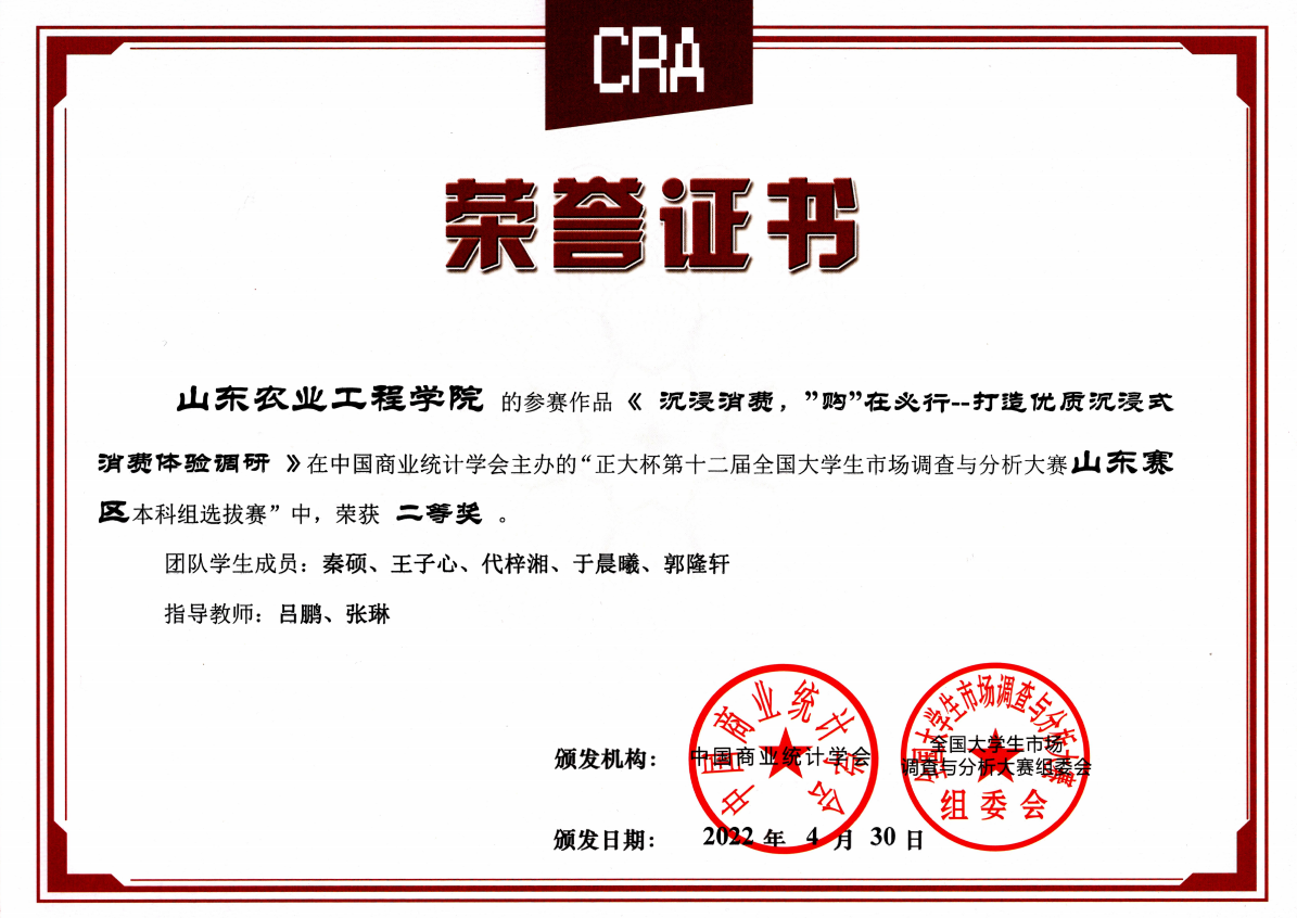 本届大赛自2021年10月启动,从校内个人选拔赛、校级团队选拔赛到省赛,历经大半年时间。受疫情影响,本次山东赛区本科组选拔赛全程在线上举行。在指导老师的悉心指导与参赛团队的精心准备下,团队的资料搜集筛选、数据抓取分析、报告撰写与修改等工作有序开展。最终经过省赛的激烈比拼,必赢经济管理学院农林经济管理专业2020级公费班两个团队的学生--秦硕、王子心、代梓湘、于晨曦、郭隆轩团队的参赛作品《沉浸消费,“购”在必行--打造优质沉浸式消费体验调研》(指导教师:吕鹏、张琳),以及高翔、包亚鹏、姜锦禧、周瑞、李文鑫团队的参赛作品《染一身书香,看云卷云舒--后疫情时代下的大学生阅读意识与需求调查》(指导教师:吕鹏、张琳),脱颖而出,分别荣获山东省赛区二等奖和三等奖。