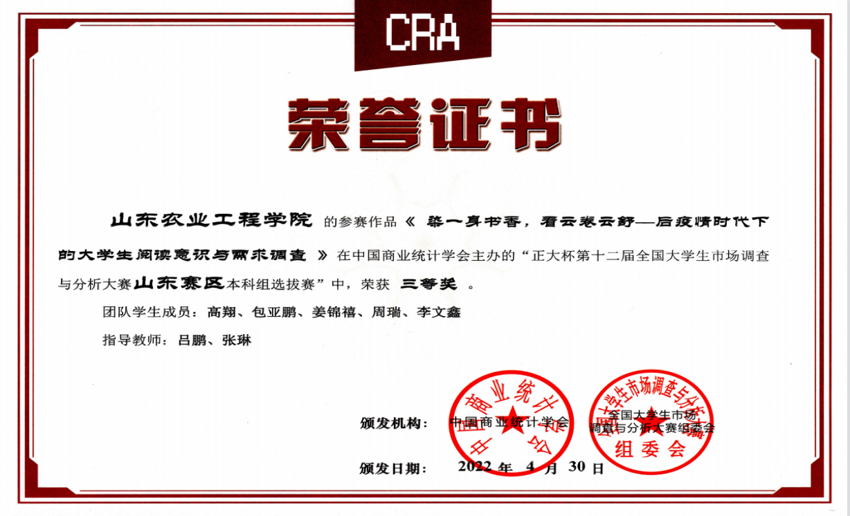 近日,我院收到了“正大杯”第十二届全国大学生市场调查与分析大赛山东赛区本科组选拔赛山东省二等奖和三等奖获奖证书。