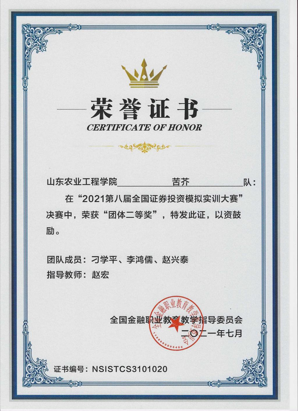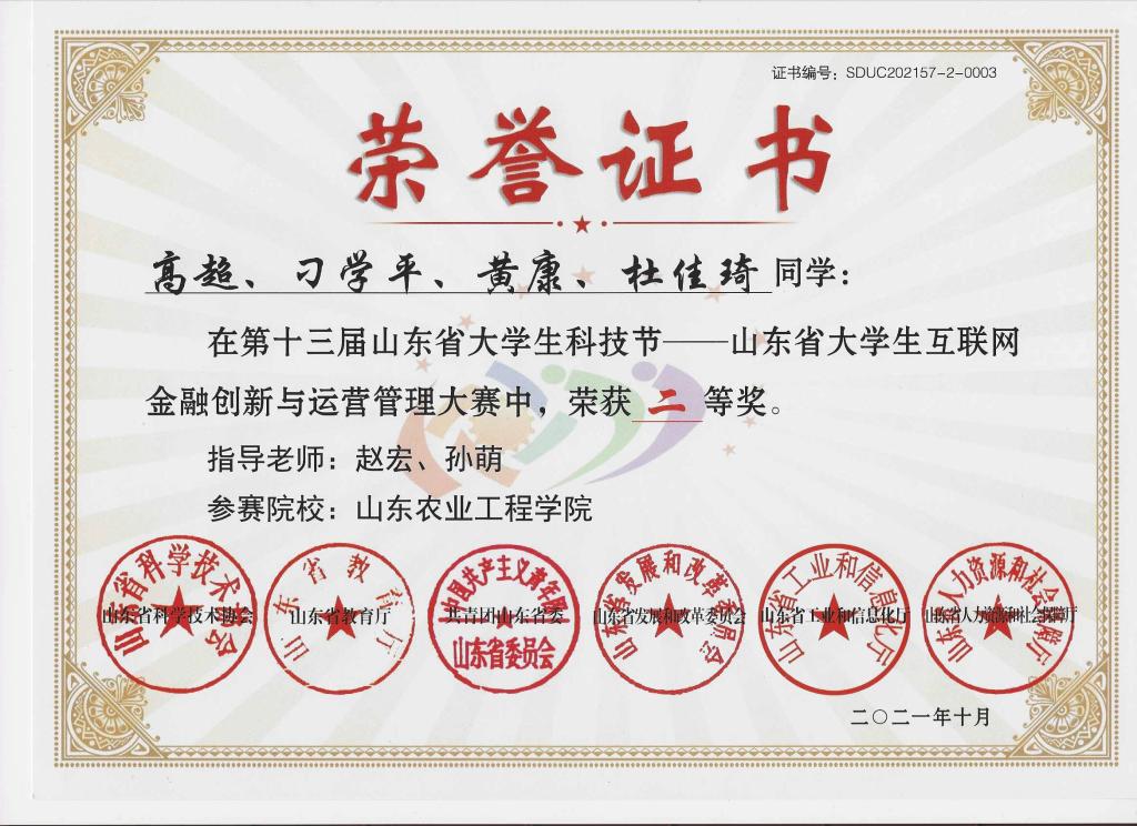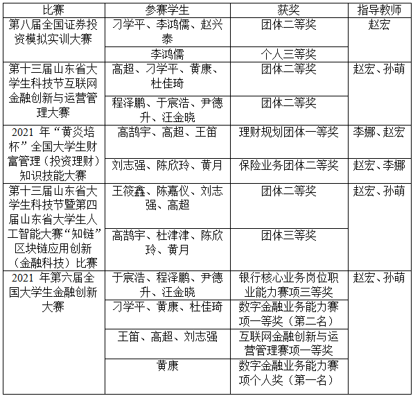 为推进金融工程专业教学改革,实施“工学结合、学做合一”,提高专业教育质量,充分发挥专业竞赛引领专业建设及课程改革的作用,今年六月份以来,金融教研室组织2019级金融工程专业学生参加了多项专业竞赛,在经管学院领导的大力支持,指导老师的悉心指导下,参赛同学刻苦训练、积极备赛,取得了优异成绩。特别是在没有任何基础的情况下,参加了区块链应用创新(金融科技)比赛,指导教师带领同学们克服重重困难,努力进取,赛出风格,赛出风采,取得了良好成绩,为金融科技领域的教学拓展和人才培养奠定了良好基础。学院获得了“黄炎培杯”全国大学生财富管理(投资理财)知识技能大赛优秀组织奖。