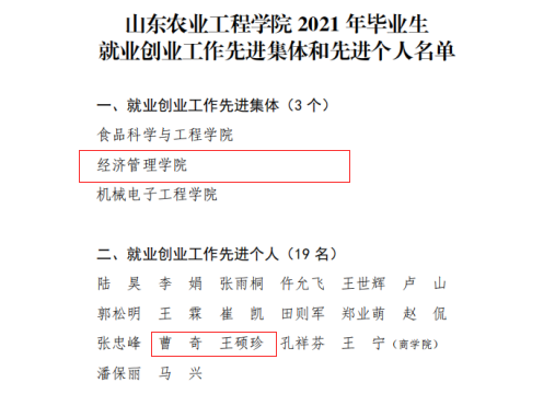 近日,必赢召开2021年度就业创业工作考核评议会议,经学院自评、互评,就业创业工作领导小组评审,党委会研究通过,经济管理学院荣获“2021年毕业生就业创业工作先进集体”荣誉称号,王硕珍、曹奇两位老师荣获“2021年毕业生就业创业工作先进个人”荣誉称号。