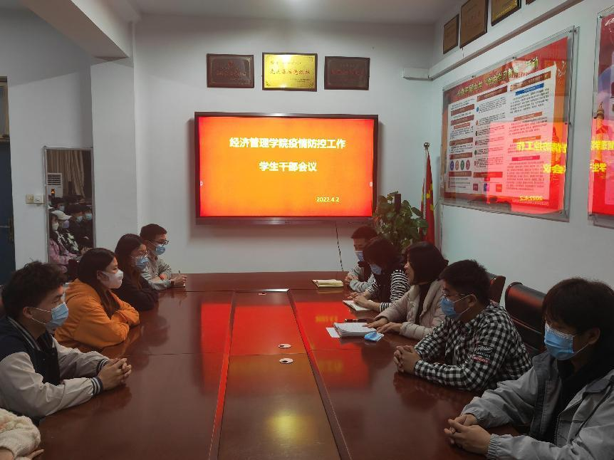 4月2日晚,经济管理学院在济南校区1号教学楼党建活动室召开疫情防控工作学生干部会议。学院团总支书记周海霞、政治辅导员王硕珍、靖荣文、学生会全体成员以及各班班长、团支部书记参加会议。