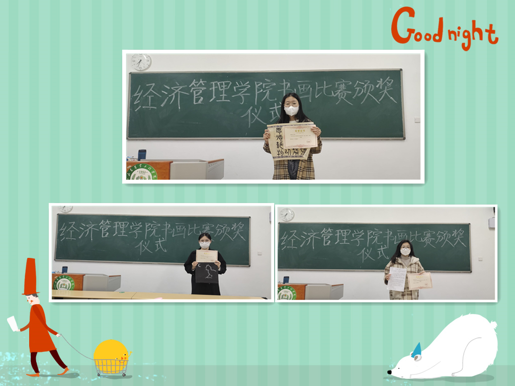 4月3日下午,经济管理学院在济南校区一号教学楼308教室举行书画比赛颁奖仪式。比赛共评选出一等奖1人,二等奖2人,三等奖3人,优秀奖2人。