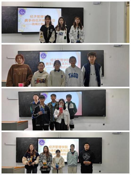 在参赛成员的努力和亲友团的呐喊助威下,20经济信息管理1班、20物流工程2班、20物流管理2班、20经济信息管理2班最终获第一二三名,辅导员王太然老师为获得前三名的班级颁发奖品。