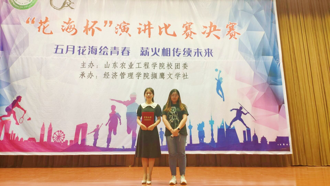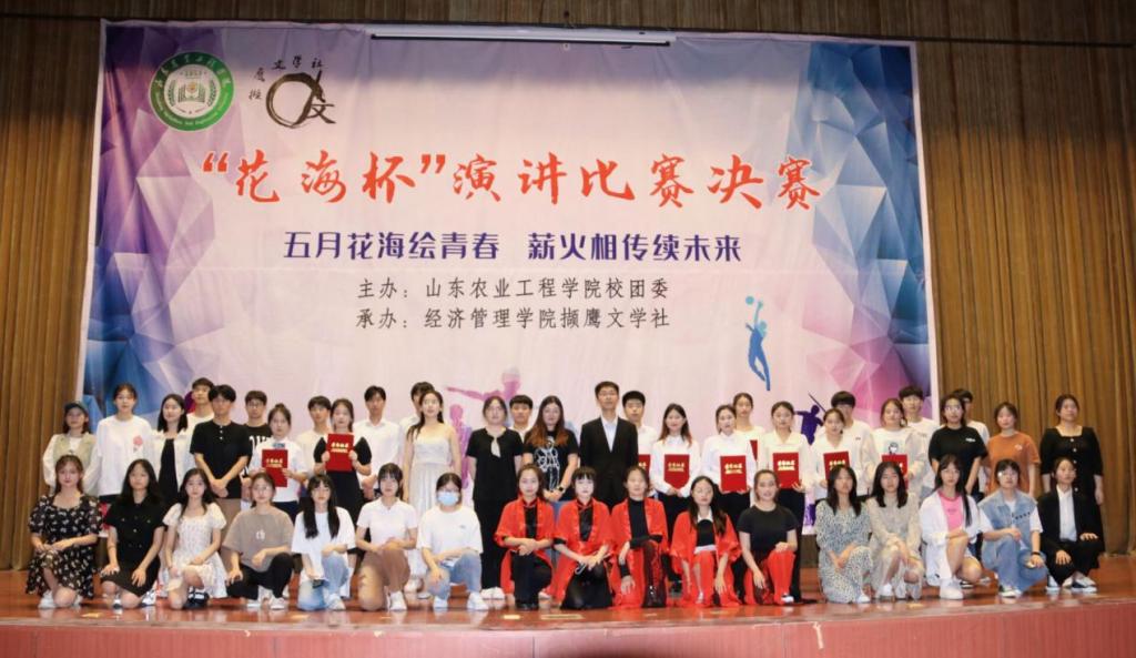 5月21日,由校团委主办、经济管理学院撷鹰文学社承办的 “花海杯”演讲比赛决赛在齐河校区学术报告厅成功举办。撷鹰文学社指导教师李娜、商学院辅导员蒋杰锐、校团委学生副书记高雨洁、校社团联合会主席金钰、撷鹰文学社社长车贵宇担任此次演讲比赛评委。