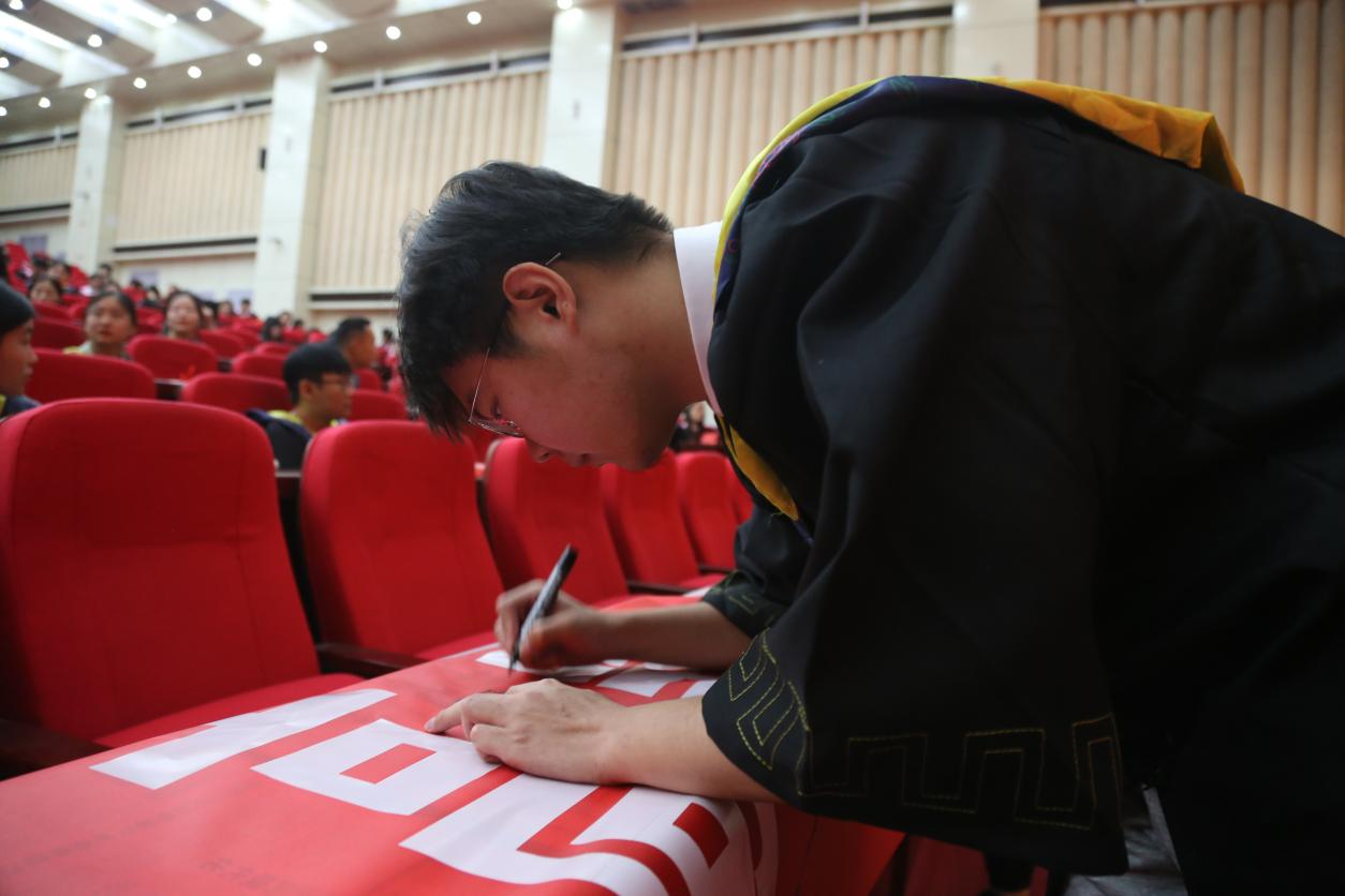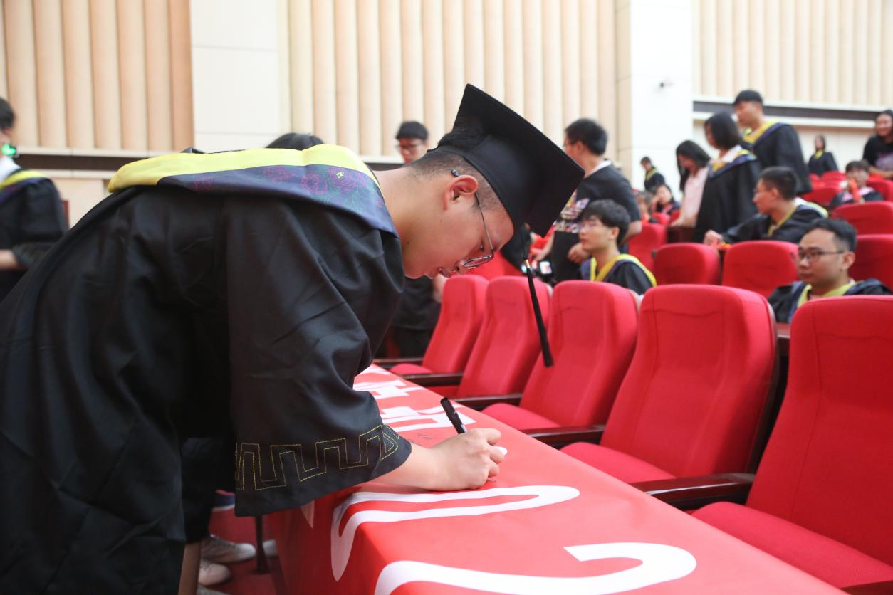 参加学士学位授予仪式的师生纷纷在印有“经管学院祝2022届毕业生一路高歌、前程似锦、事业有成”的横幅上签下自己的名字,为自己的大学生活画下圆满的句号。