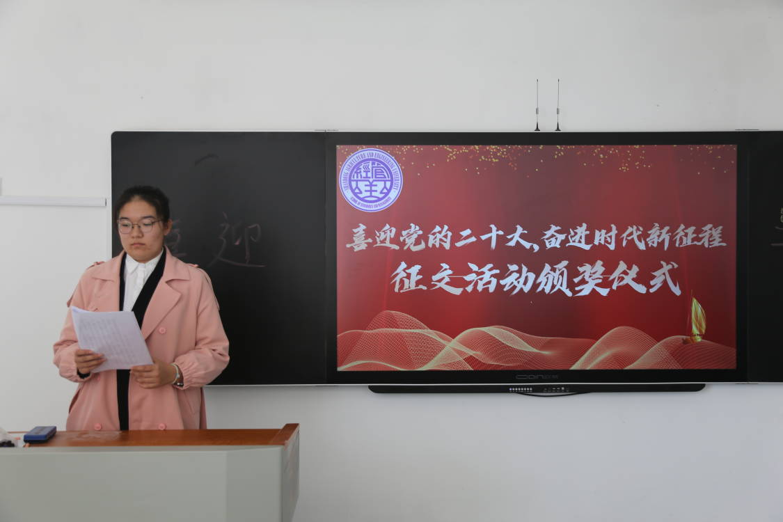 10月14日中午,经济管理学院“喜迎党的二十大,奋进时代新征程”主题征文活动颁奖仪式在齐河校区二号教学楼510教室举行。本次颁奖仪式由院学生会秘书处高一心主持,经济管理学院团总支书记周海霞出席并为获奖同学颁发荣誉证书。