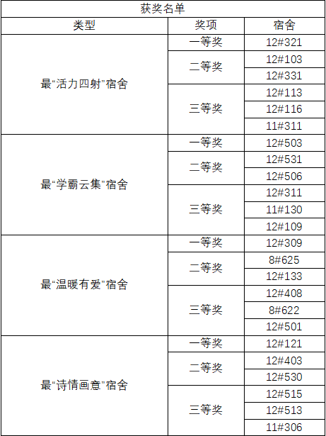 本次活动设最“温暖有爱”宿舍、最“学霸云集”宿舍、最“活力四射”宿舍、最“诗情画意”宿舍四个赛道,共评选出了一等奖四名,二等奖八名,三等奖十二名。