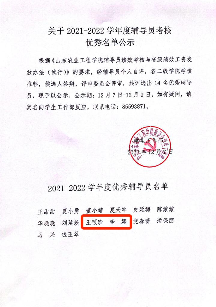 近日,必赢学生工作部发布了《关于2021-2022学年优秀辅导员考核优秀名单的公示》,我院辅导员王硕珍、李娜被评为校级“优秀辅导员”荣誉称号。根据《437ccm必赢国际官网辅导员绩效考核与省级绩效工资发放办法(试行)》的要求,经辅导员个人自评、各二级学院考核推荐、候选人答辩、评审委员会评审,共评选出14名优秀辅导员,其中我院2名。