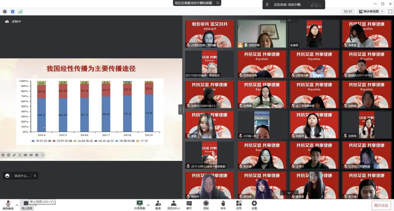 会议中,师生认真听取讲座,积极学习防治艾滋病的相关知识,并与王洁科长共同观看了青春健康同伴社精心制作的“预防艾滋”宣传视频,视频获得了到场专家、师生的一致肯定。会议最后,青年学生积极与王洁科长进行互动交流,踊跃提出内心疑问,王洁科长针对学生的提问进行一一解答。