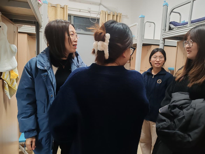 在走访过程中,曲文俏院长与同学们亲切交谈,不仅关心同学们的学习情况,了解大家的学习进度,还深入了解生活日常,细心询问学生是否遇到生活上的困难。面对老师的亲切关怀,学生们畅所欲言,分享宿舍生活趣事。同时,李娜老师积极鼓励同学们营造良好的宿舍文化氛围,还针对冬季用电安全、防火等问题做出重要提醒,确保宿舍生活安全无虞。对于同学们提出的各种问题,老师们耐心倾听并给予解答,让同学们切身感受到学院的温暖。