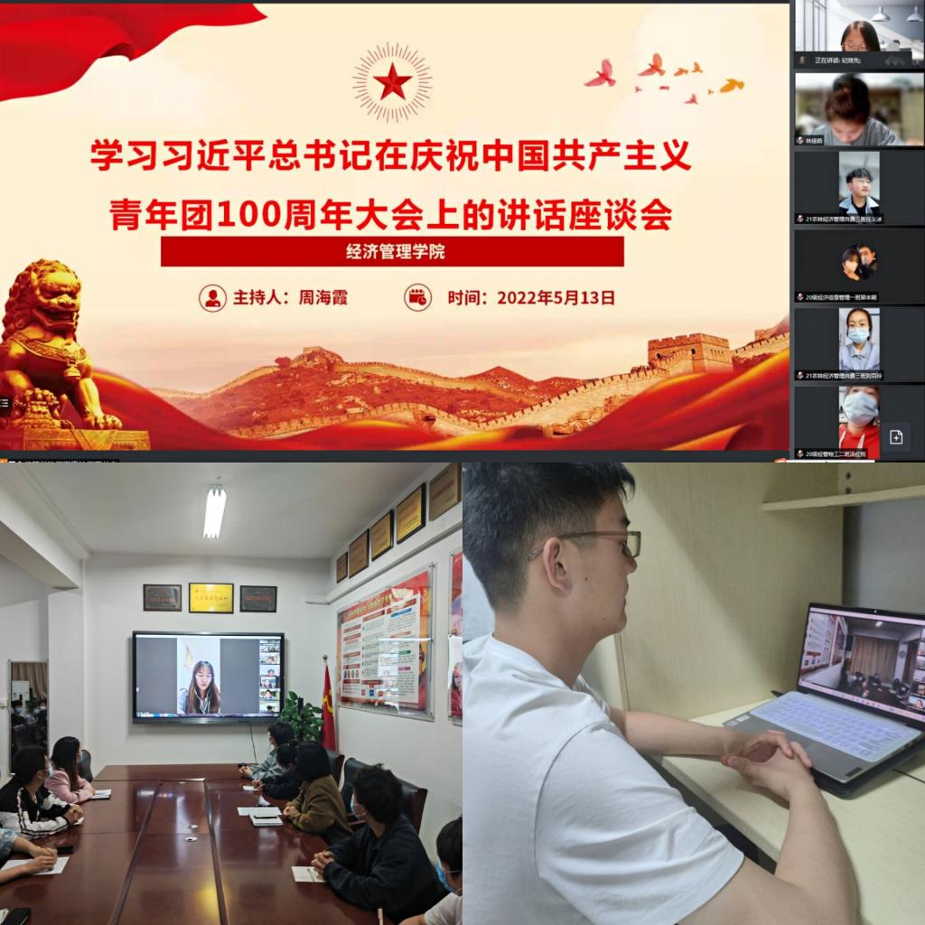 5月13日,经济管理学院团总支举行学习贯彻习近平总书记在庆祝中国共产主义青年团成立100周年大会上的重要讲话精神座谈会,座谈会采用线上线下相结合的方式,学院团总支书记周海霞及两校区学团干部参与座谈会。